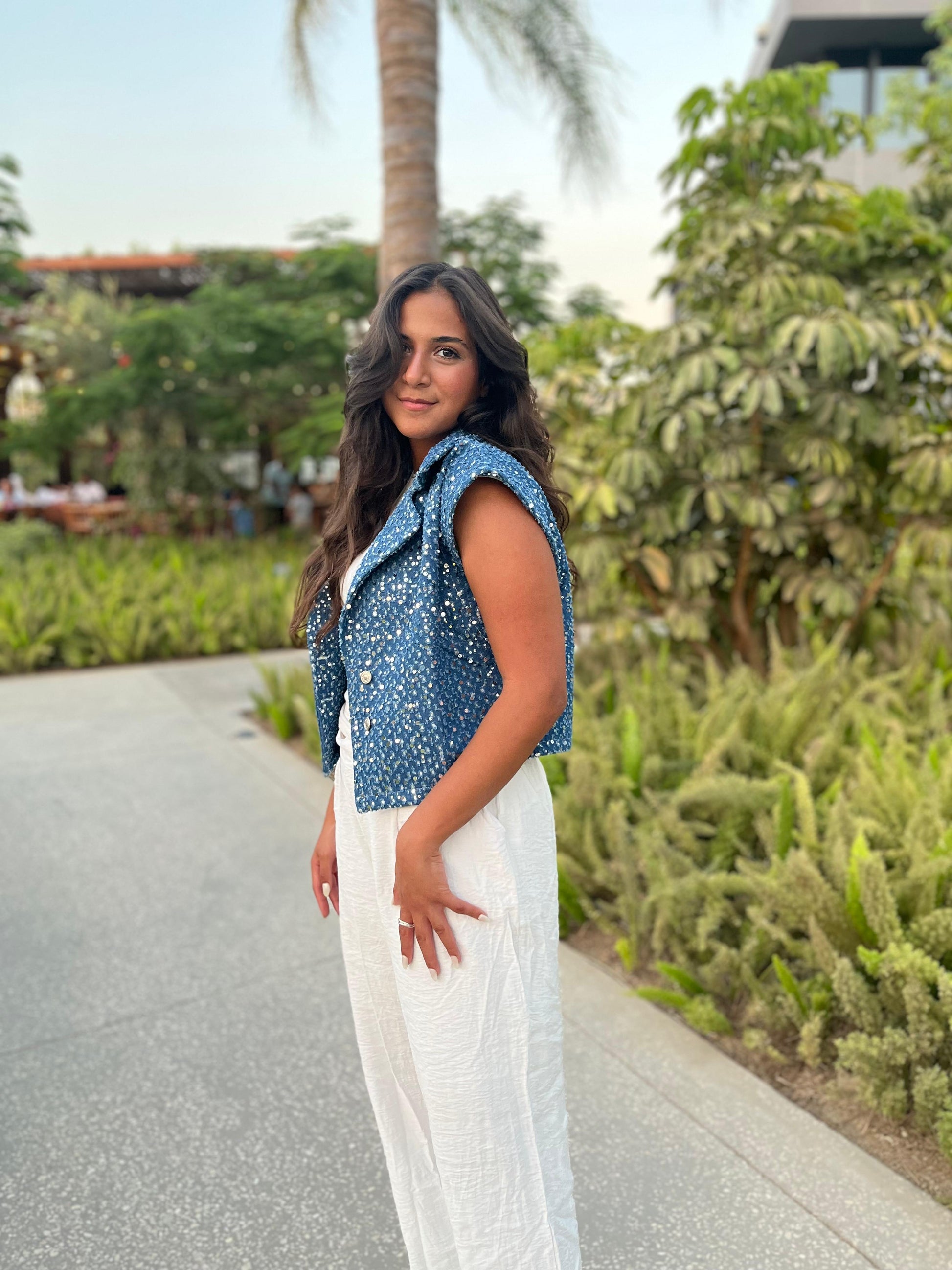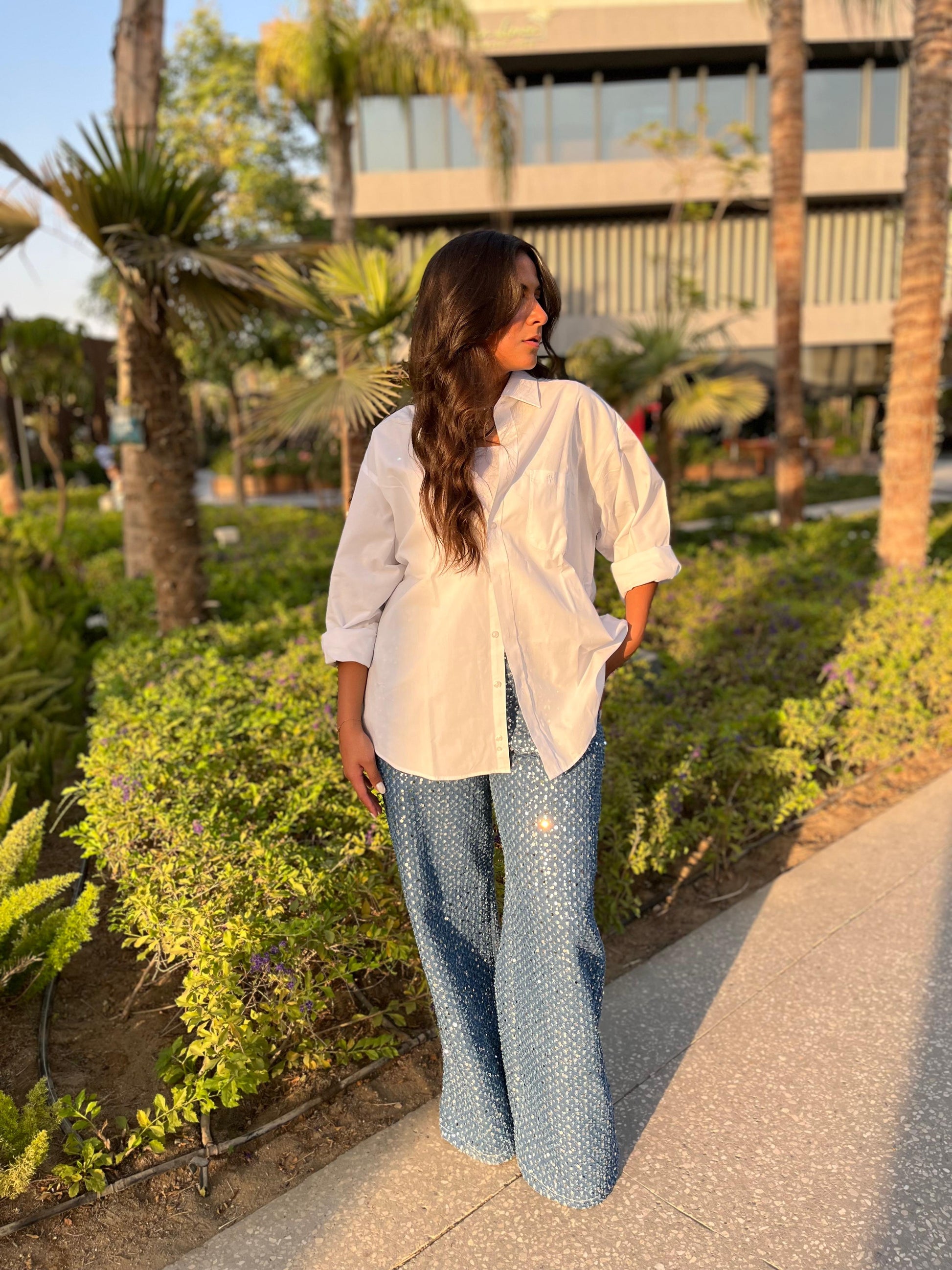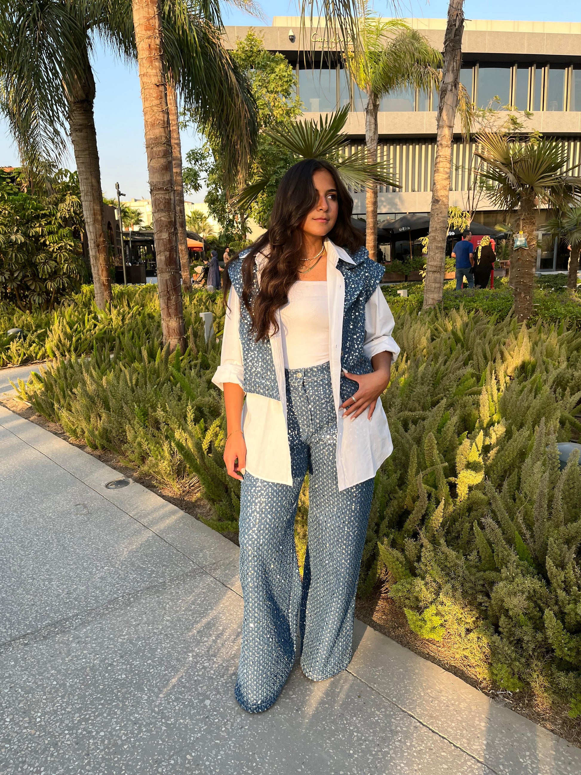 The Denim-dusk Set embodies sophisticated elegance with its embroidered rich beads and impeccable finishing. Designed for versatility, each piece can be worn separately or layered together, adding a touch of tasteful bling to any outfit. Perfect for elevating a casual look or enhancing your ensemble for a night out.